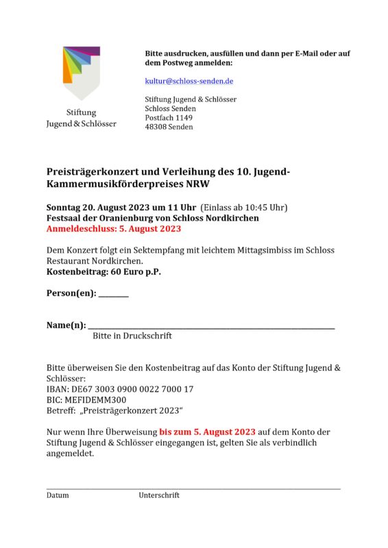 Ein Jubiläum feierte das diesjährige Wertungsspiel für den Jugend-Kammermusik-förderpreis an der Landesmusikakademie NRW. Bereits zum zehnten Mal ermöglichen die Stiftung Jugend & Schlösser (Senden) und die Andreas Mohn Stiftung (Bielefeld) die Vergabe der Preise. Beim feierlichen Preisträgerkonzert in der Oranienburg in Schloss Nordkirchen präsentieren sich die drei jungen Sieger-Ensembles.